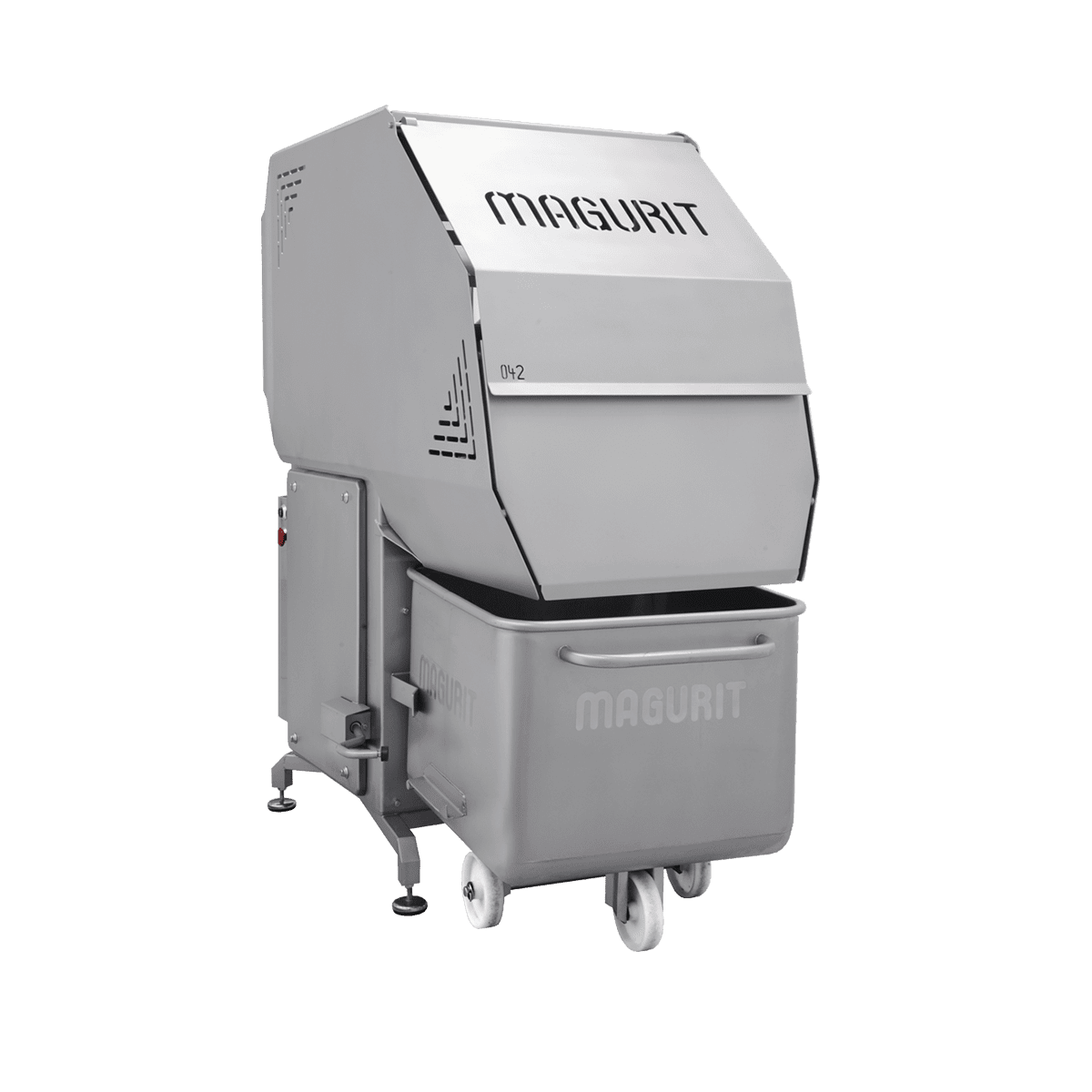 The FROMAT 042 is suitable for small and mid-size producers. Cutting of E2-blocks is very easy with this machine. The blocks are fed into the cutting area by a pneumatically operated lifting chute. The space saving and solid execution of this model is stable and reliable. Product is discharged directly into 200 ltr. meat trolleys.
