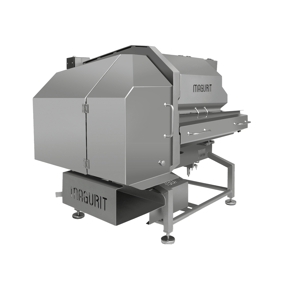 The compact GALAN 920, with 230 mm (9 ") x 100 mm (4") cutting chamber, is particularly well-suited for processing poultry and fish products since the raw material is i.a. not larger than the max. cutting chamber size is. Therefore, the blades of the GALAN 920 with 2 mm for the sickle blades and 1 mm for the circular blades cut particularly gentle the raw material. As shown in the picture below, the machine can be opened for cleaning in just a few steps. The same applies to GALAN 930 and GALAN 960. The entire product-contact-area is very easily accessible and therefore of course cleanable. This is an important investment aspect in the food industry in general, but especially in poultry, fish and RTE (ready-to-eat) productions.