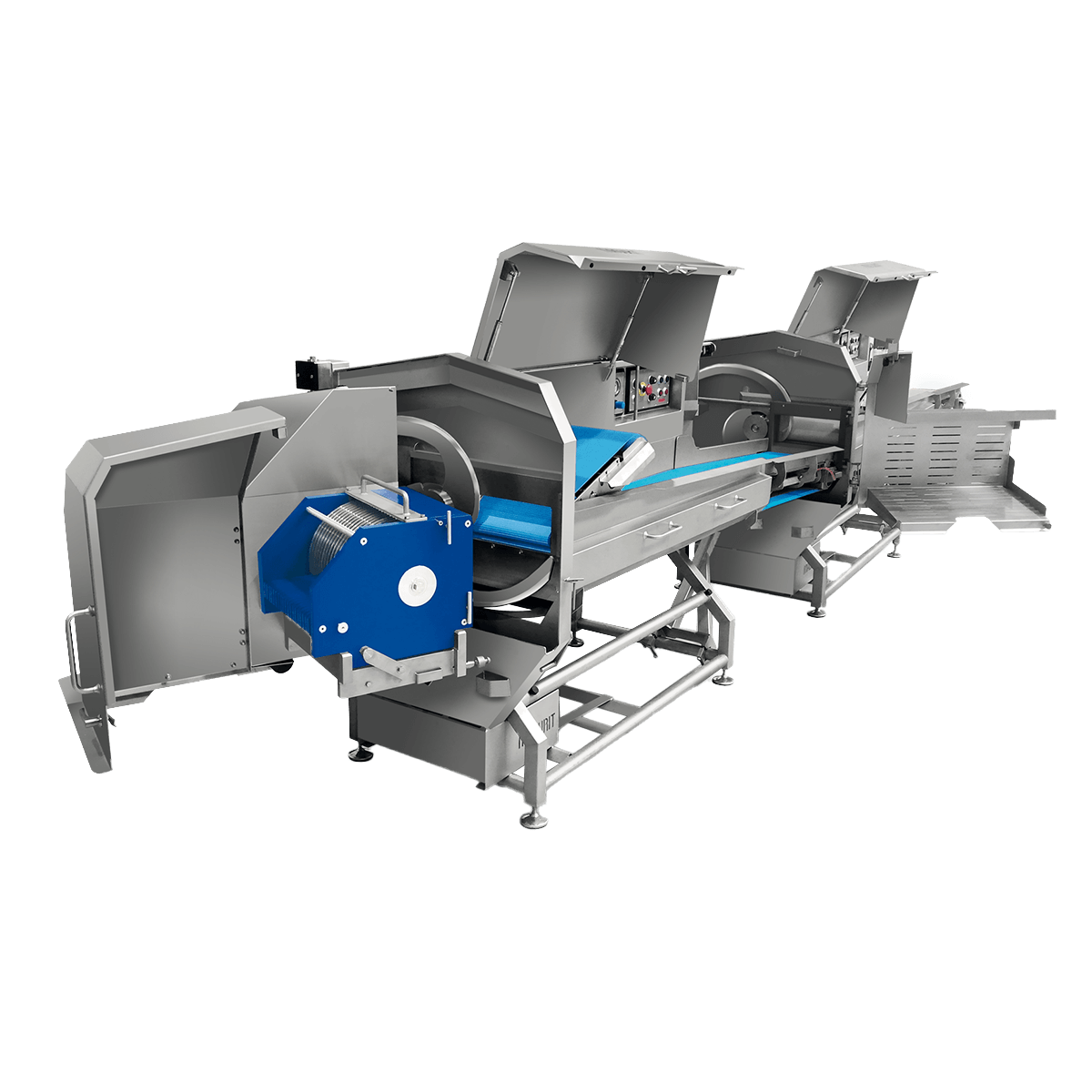 For cutting whole muscles, whether beef, pork or turkey, three-dimensionally into clean cubes and stripes, we offer the GALAN 930 3D. The muscles are first cut via a conveyor scimitar blade unit GALAN 930 (1D) into slices with the required thickness. These slices are placed directly on the infeed belt of a two-dimensionally cutting GALAN 930 (2D), which cuts the slices into cubes or strips. Thus, all three dimensions are gently cut. Also sinewy material can be cut thereby. Crust freezing of the goods is not necessary.