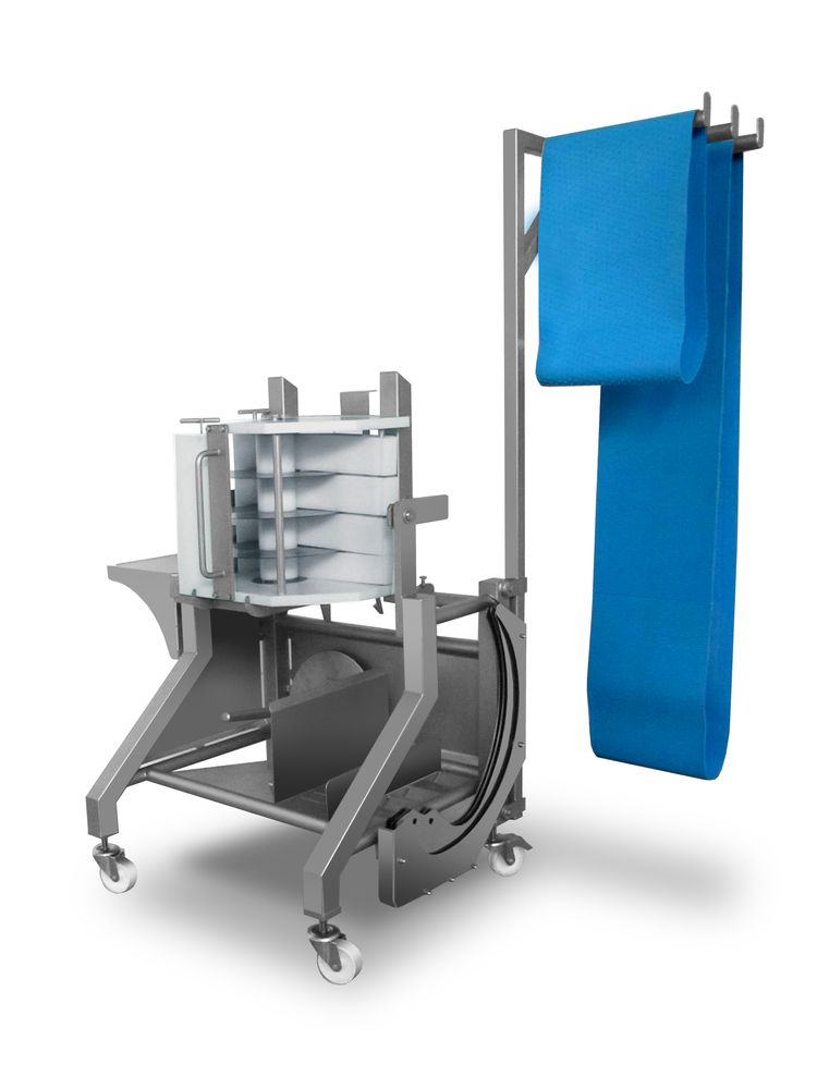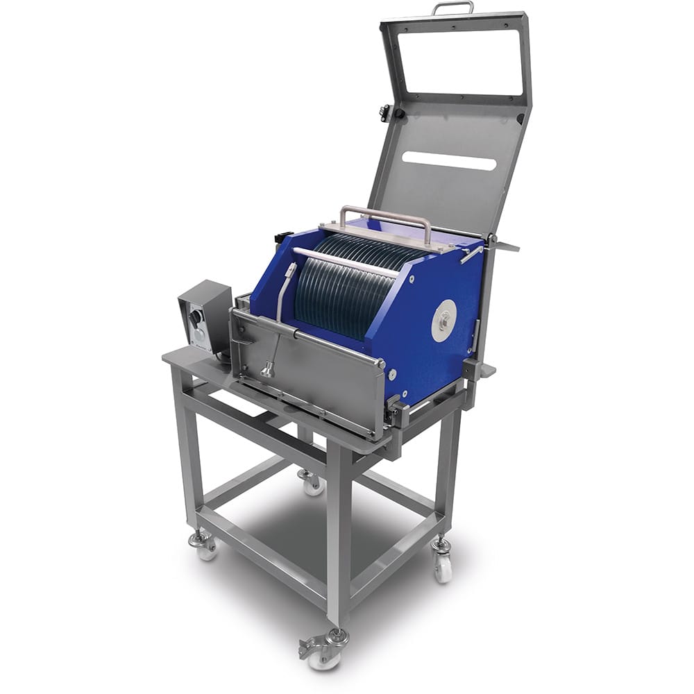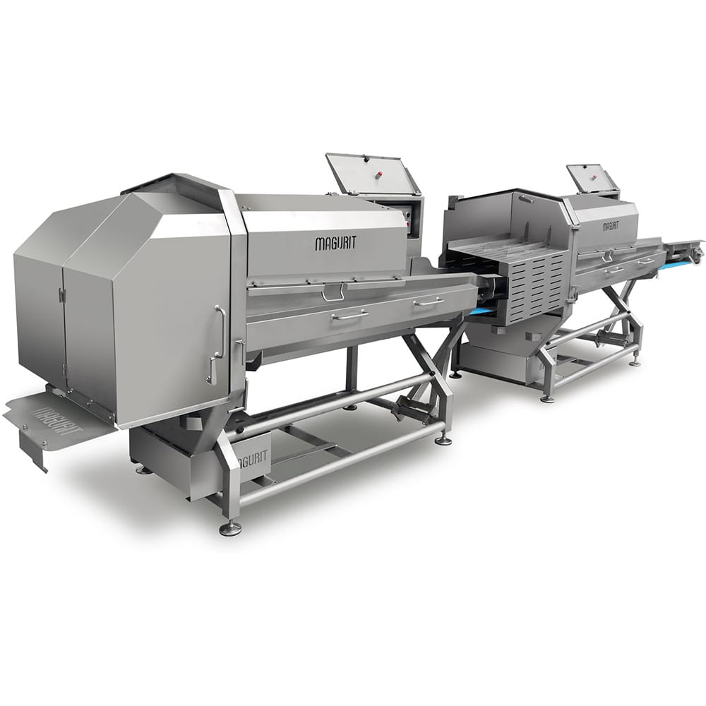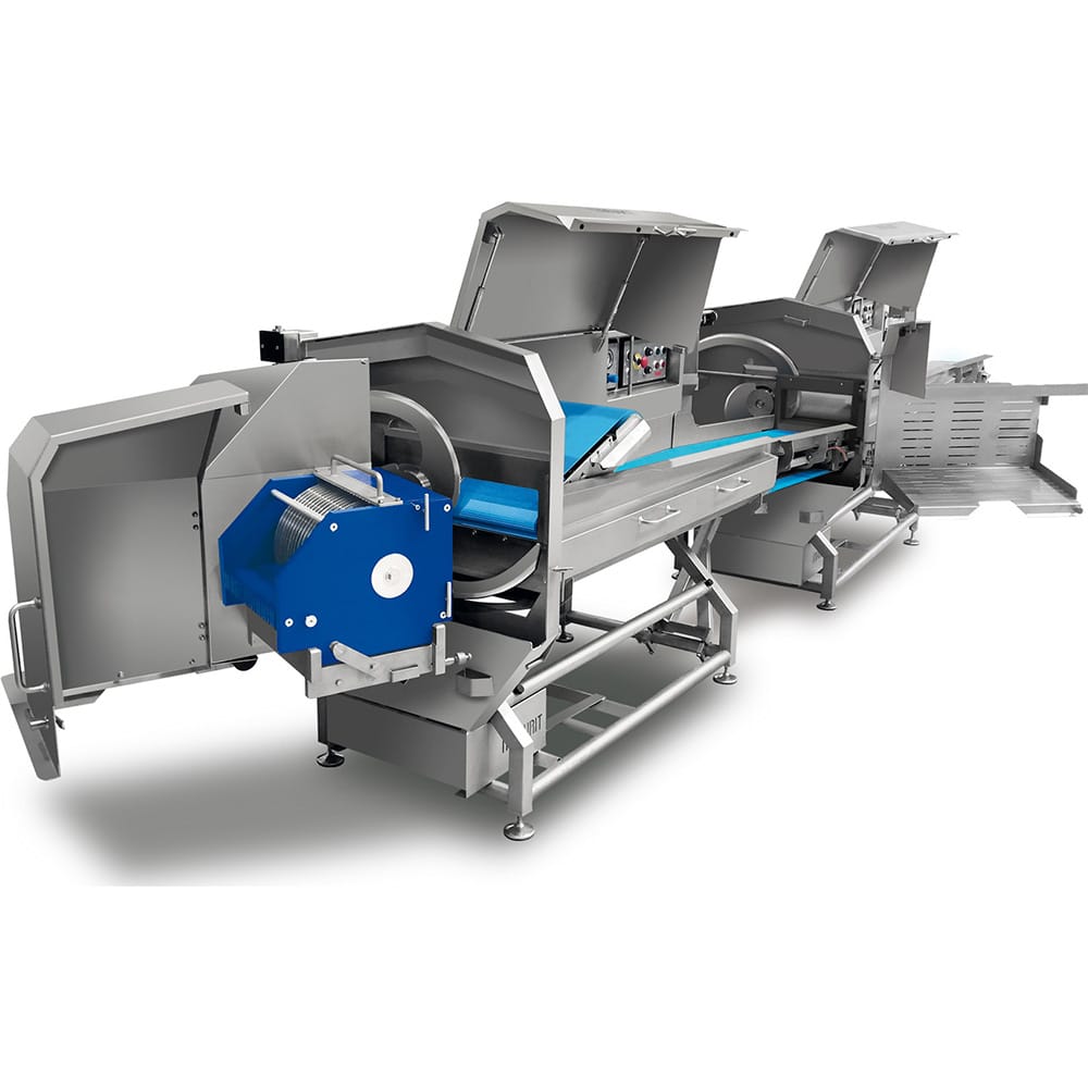 For cutting whole muscles, whether beef, pork or turkey, three-dimensionally into clean cubes and stripes, we offer the GALAN 930 3D. The muscles are first cut via a conveyor scimitar blade unit GALAN 930 (1D) into slices with the required thickness. These slices are placed directly on the infeed belt of a two-dimensionally cutting GALAN 930 (2D), which cuts the slices into cubes or strips. Thus, all three dimensions are gently cut. Also sinewy material can be cut thereby. Crust freezing of the goods is not necessary.