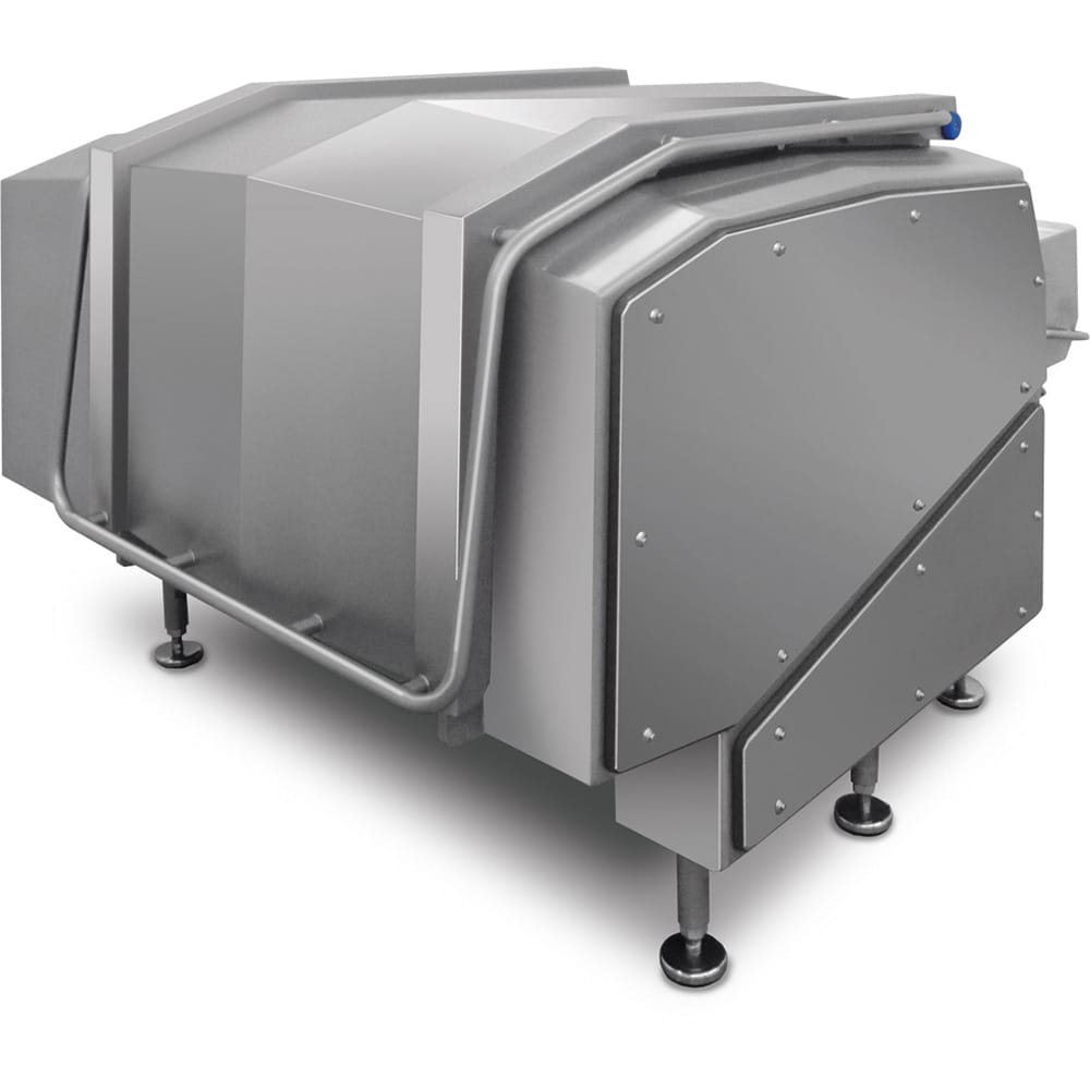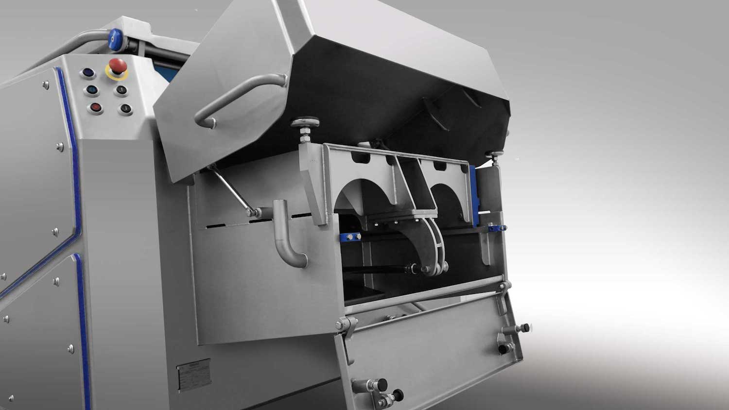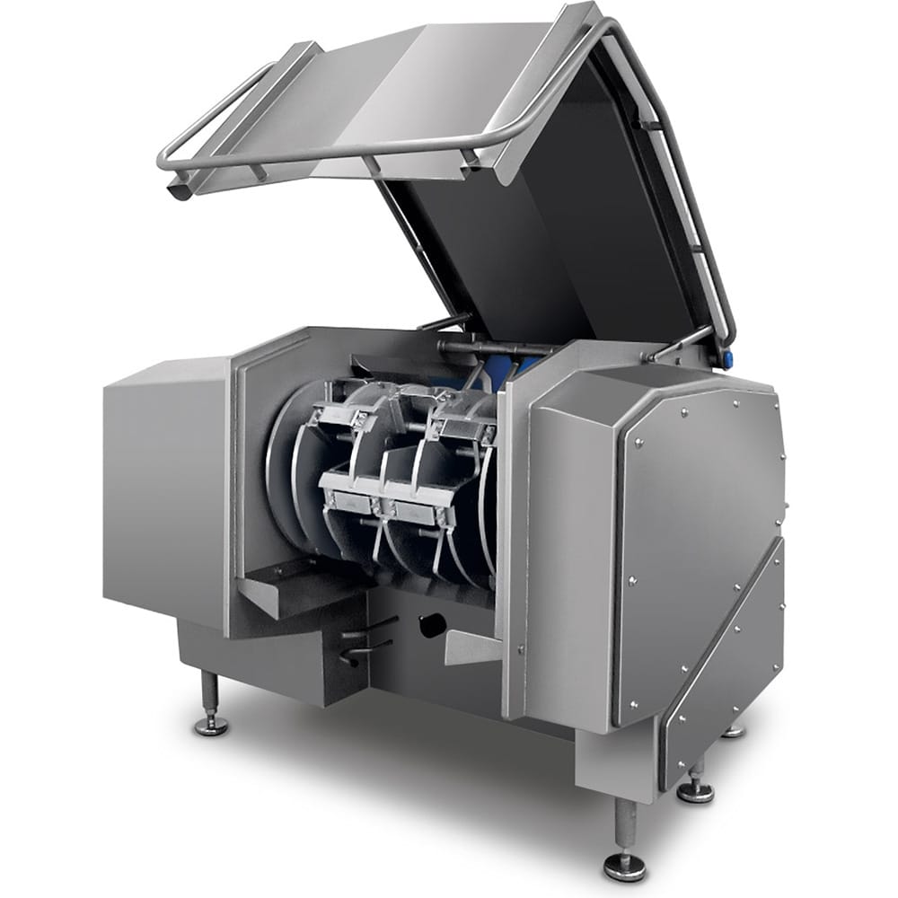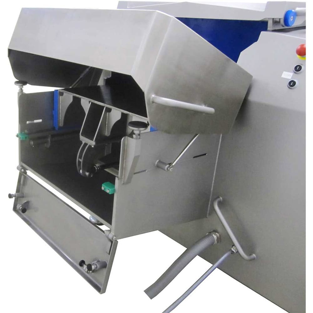 STARCUTTER LN, LN being an abbreviation for low noise, is the world’s first frozen block rotation-cutter, which development was mainly influenced by the target of reducing the vibration and therewith the noisiness created while cutting the often rock hard frozen blocks, and therewith creating an improved workplace for the operators. To achieve this target the machine frame is built from very thick sheet stainless steel which absorbs vibrations, encapsulating the cutting area from three sides. Furthermore vibration damper are installed between the cutting drum and machine frame, so that the sound propagation between blades and machine frame is eliminated. Instead of belt or chain drive the motor on the STARCUTTER LN is mounted directly onto the shaft of the cutting drum, eliminating mechanical sounds from the drive. And last but not least the machine cover is a sheetmetal sandwich design, filled with noise absorption material.