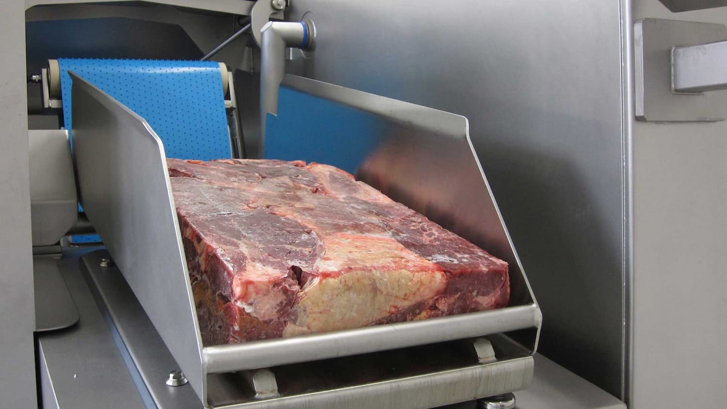 El corte de bloques congelados de carne de res, aves o de pescado, en precisos cubos y tiras, esto es lo que destaca de los modelos de corte tridimensional de la DICECUT® 502 y 506. Estas máquinas cortan la materia prima en cubos o tiras con longitudes de arista entre 10 y 60 mm. Las temperaturas ideales de corte fluctuan entre -6°C y -18°C y son muy dependientes sobre el producto seleccionado y del tamaño del corte. Siempre se cortará sobre un área congelada donde un temple no será necesario. Por lo tanto, se puede evitar totalmente cualquiera pédida de jugos de la carne, el cual oscila entre el 2% y 6% durante el templado, lo que significa un ahorro sustancial en los costes de materia prima. Además, se ahorran parte de los costes de energia necesarios, para recongelar un producto temperado a una temperatura de -18°C, ya que el producto nunca se acerco al punto de descongelamiento. Por tal motivo todo el proceso de fabricación se acelera de manera significativa, esto también implica mucho menos carga microbiologica del producto. También se reducen significativamente los costes de producción y se optiene un rendimiento mucho más alto.