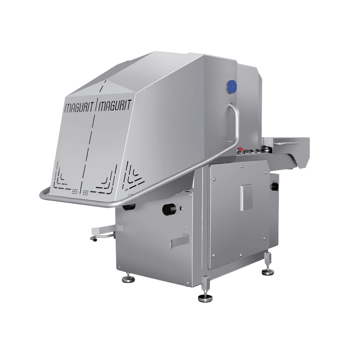 Kein anderer Gefrierschneider ist so vielseitig einsetzbar wie die UNICUT 555 Serie von MAGURIT, sowohl als Vorschneider wie auch als Präzisionsschneider. Für jedes gewünschte Schneidergebnis stehen entsprechende Messerköpfe zur Verfügung. UNICUT sind auch immer da einzusetzen, wenn es um die Verarbeitung von Rohstoffen geht, die nicht auf Edelstahl rutschen, wie Süßwaren oder Molkereiprodukte. Hier bietet das Vorschub- und Niederhaltersystem den entscheidenden Vorteil. Die UNICUT 555, mit Schneidraummaßen von 240 x 480 x 650 mm, sind auf alle gängigen Blockformen ausgelegt. Durch die im Niederhalter integrierte Blockhöhenabfrage wird der Schneidhub automatisch auf die Höhe der zu verarbeitenden Blöcke eingestellt, und somit ein Höchstmaß an Schneideffizienz erreicht, das kein anderer Gefrierschneider bietet. Neben dem Blockschneider UNICUT 555 bieten wir diese Maschinenserie auch als Plattenschneider für besonders flache Blöcke oder Scheiben an, den DICECUT® 550. Hiermit können Platten oder Blöcke mit einer max. Höhe von 70 mm in besonders dünne Scheiben, Streifen oder auch Würfel geschnitten werden.